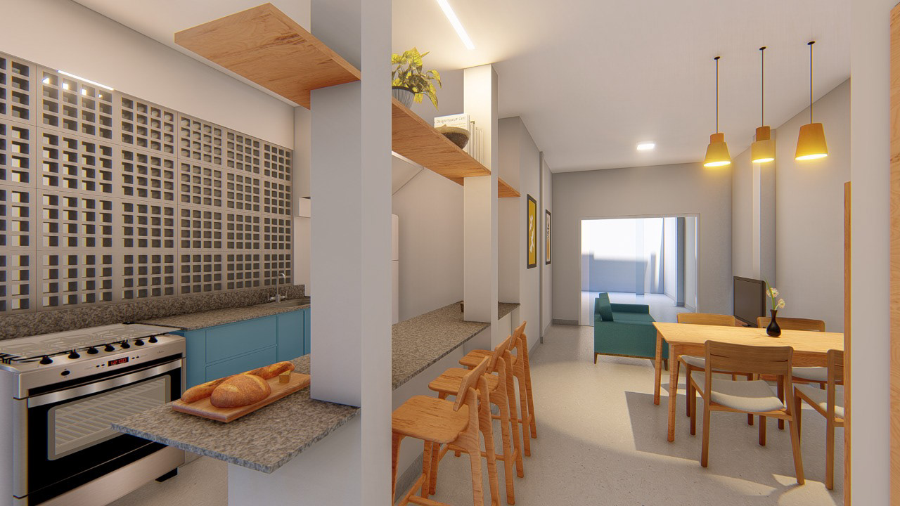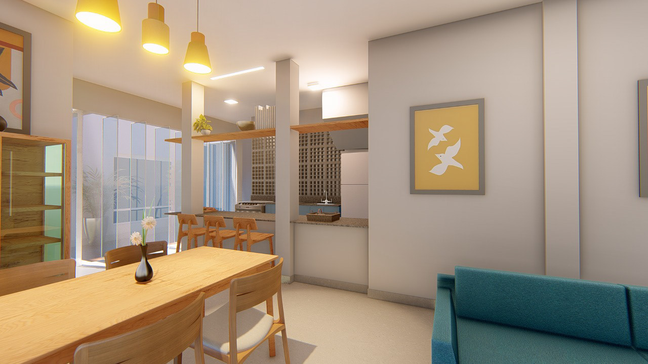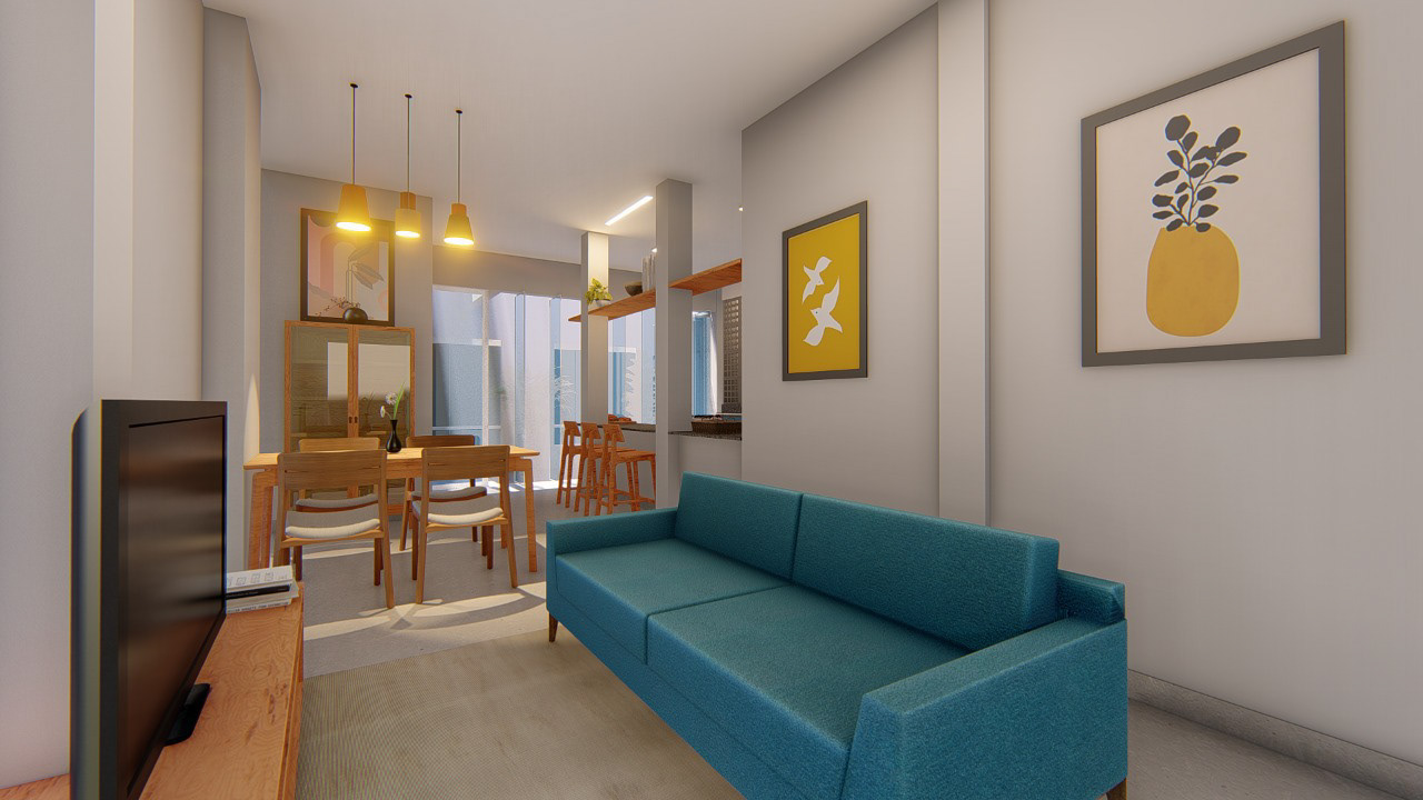 O projeto apostou em paredes claras para potencializar a reflexão da luz, aliadas a pontos estratégicos de cor em elementos como o sofá e a marcenaria. A escolha de materiais neutros e acabamentos discretos garante equilíbrio visual, permitindo que os toques coloridos se destaquem sem sobrecarregar o espaço. A integração entre sala e cozinha reforça a sensação de amplitude, enquanto a conexão visual com o pátio interno traz leveza e frescor ao ambiente.