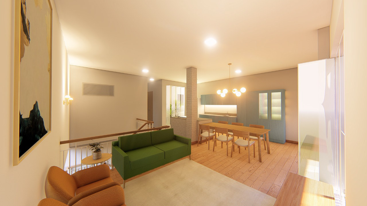 No pavimento térreo, a garagem foi adaptada para receber uma segunda moradia independente, destinada a familiares. Esse novo espaço, compacto e funcional, abriga sala de estar, cozinha e sala de jantar integradas, dois dormitórios e um banheiro. Assim como no andar superior, a iluminação natural chega por meio de um jardim de inverno central, garantindo que tanto a casa principal quanto a unidade inferior se beneficiem do grande átrio que se tornou o coração da construção.