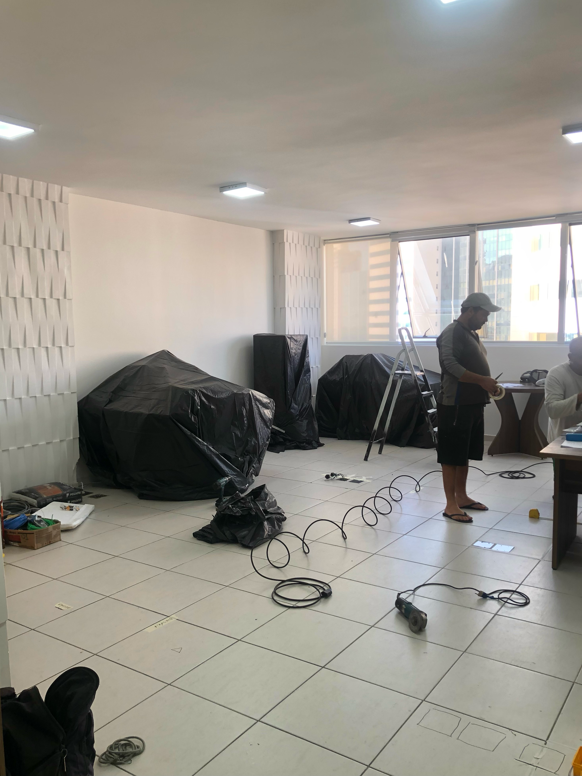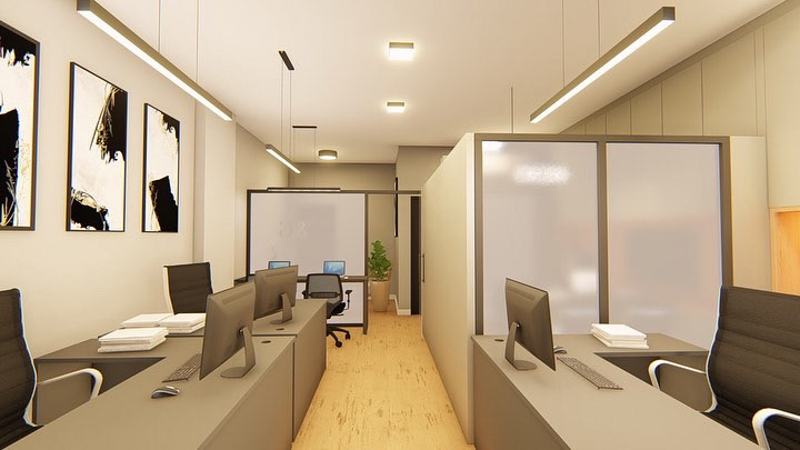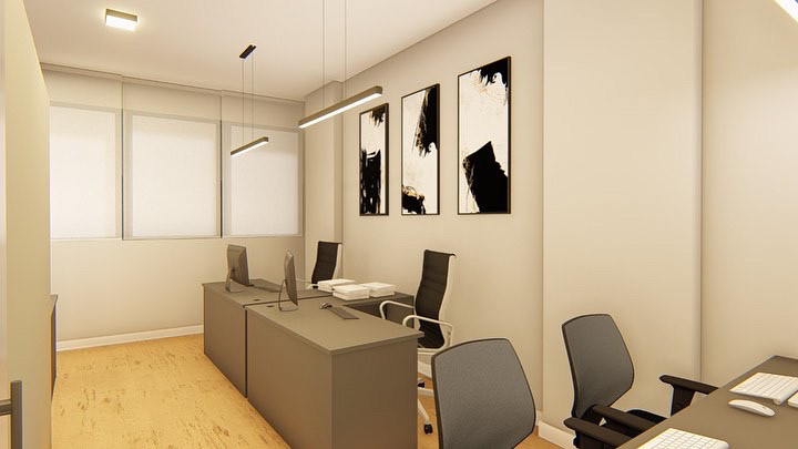Optamos por estruturas em metalon preto, paredes brancas e marcenaria cinza com detalhes em madeira natural que harmonizam com o piso. A iluminação foi planejada para unir técnica e conforto: pendentes lineares e focais nas estações de trabalho garantem praticidade, enquanto a iluminação geral suave mantém a atmosfera agradável. O conjunto cria um local elegante, acolhedor e adequado para receber clientes com profissionalismo.