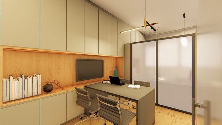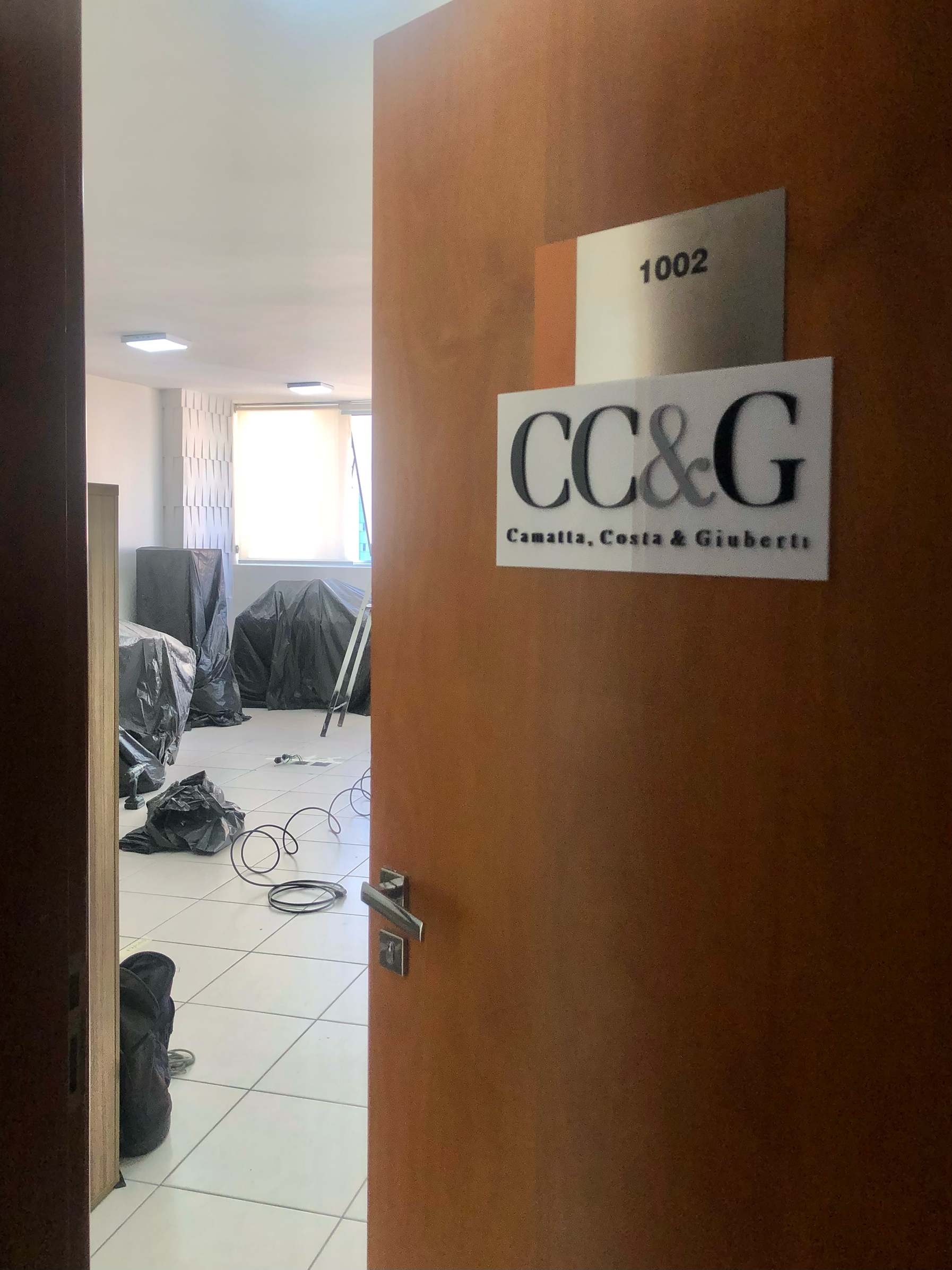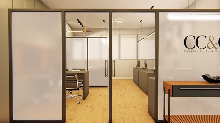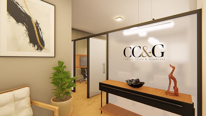 No projeto do escritório de advocacia CC&G, buscamos traduzir a identidade visual da marca em todo o espaço. As cores da logo — cinza, preto e branco — foram aplicadas de forma predominante, equilibradas pelo piso amadeirado para quebrar a frieza e trazer acolhimento. O objetivo era criar um ambiente sóbrio, mas sem recorrer aos materiais tradicionais de escritórios jurídicos, apostando em soluções mais contemporâneas.
