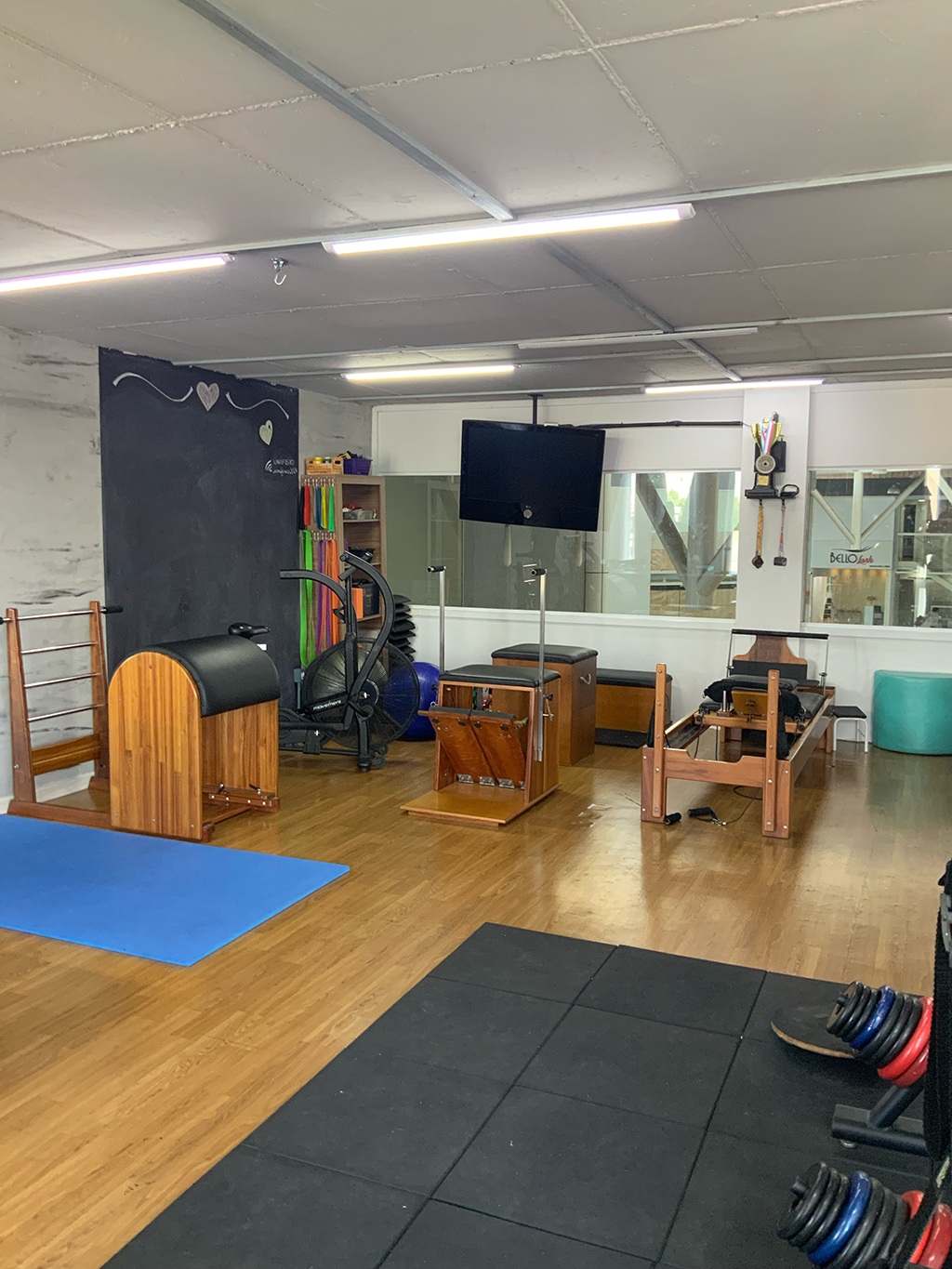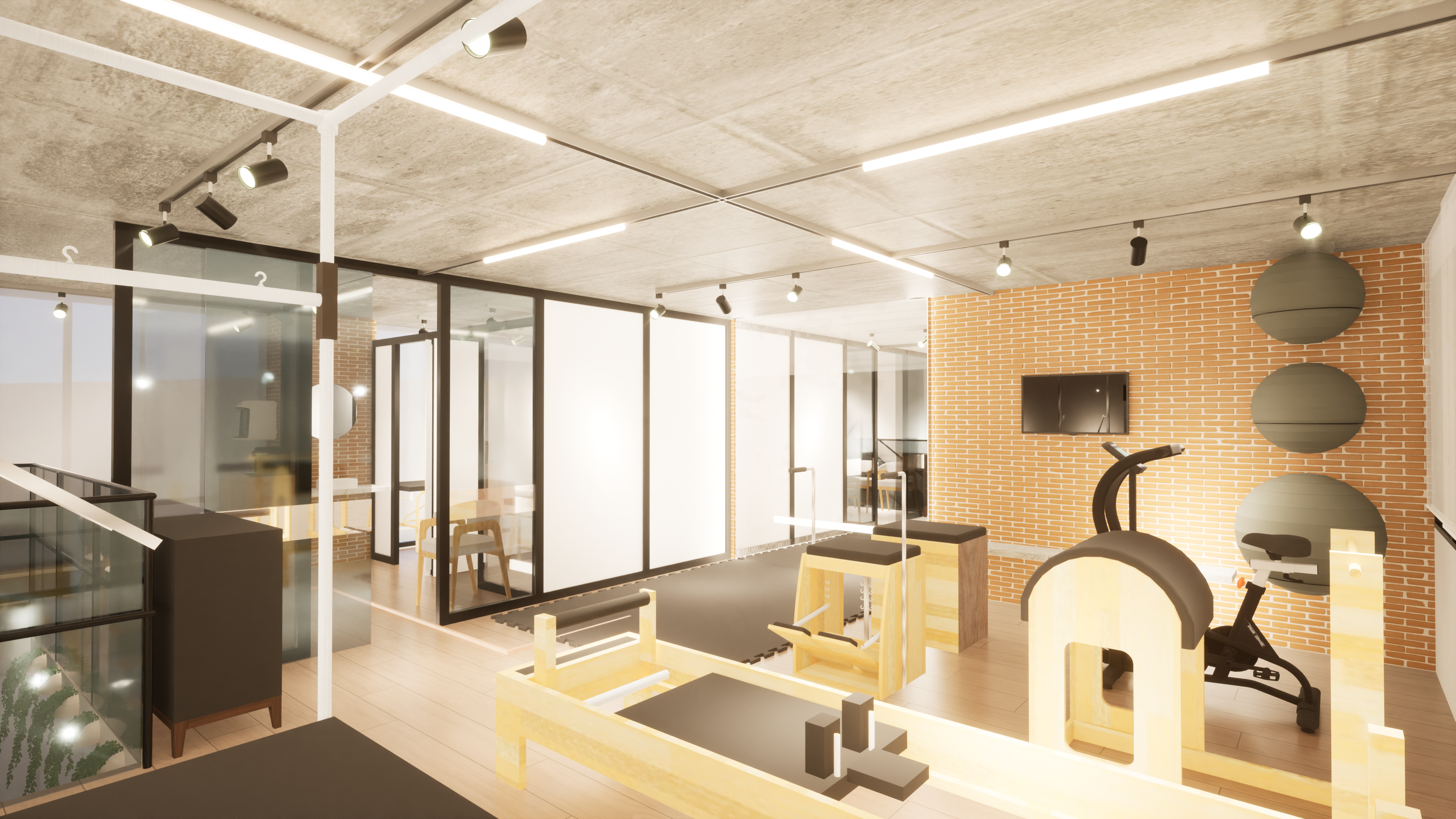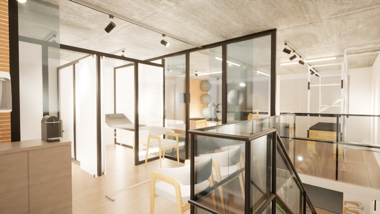 No projeto deste estúdio de pilates, a proposta foi unir a estética industrial já existente a uma dose de modernidade e sofisticação. Mantendo elementos como concreto aparente e tijolos rústicos, o espaço ganhou toques elegantes com metais pretos e divisórias de vidro, criando uma atmosfera equilibrada e nada caricata.